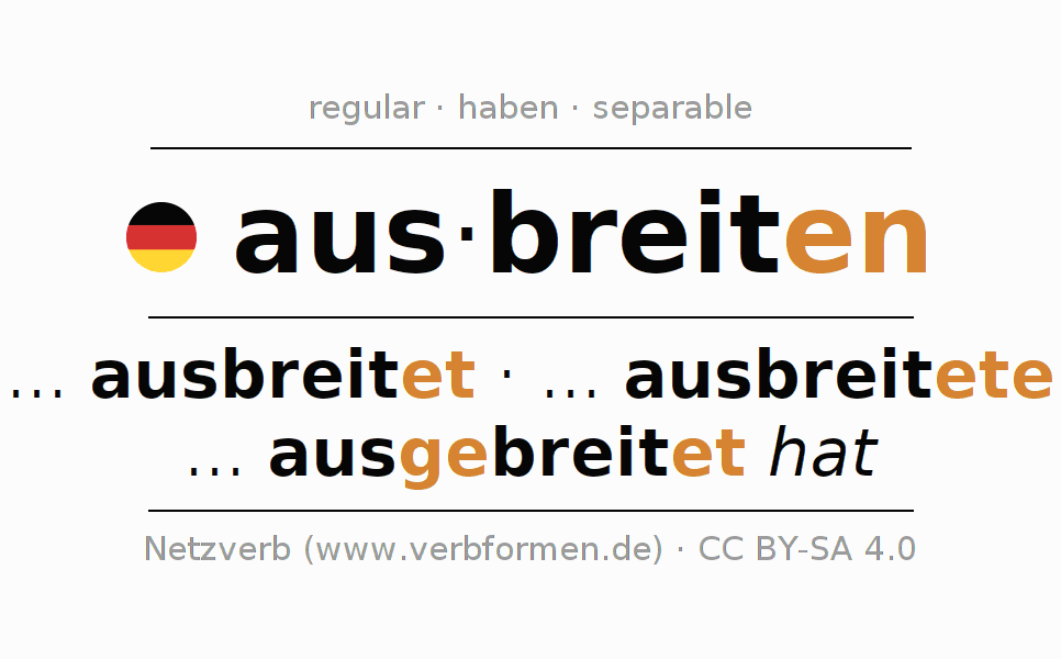 - Present: breit(e) (du) aus, breiten wir aus, breitet (ihr) aus, breiten Sie aus