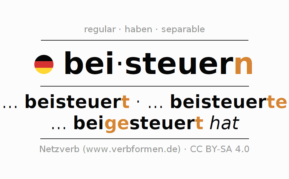 Clear online presentation of the verb 'bei·steuern' including all verb forms. Therfore, the flection of the verb bei·steuern can be useful for homework, tests, exams, German lessons in school, learning German, during studies and adult education. Especially for people learning German it is essential to know the correct flection of a verb (... beisteuert - ... beisteuerte - ... beigesteuert hat).