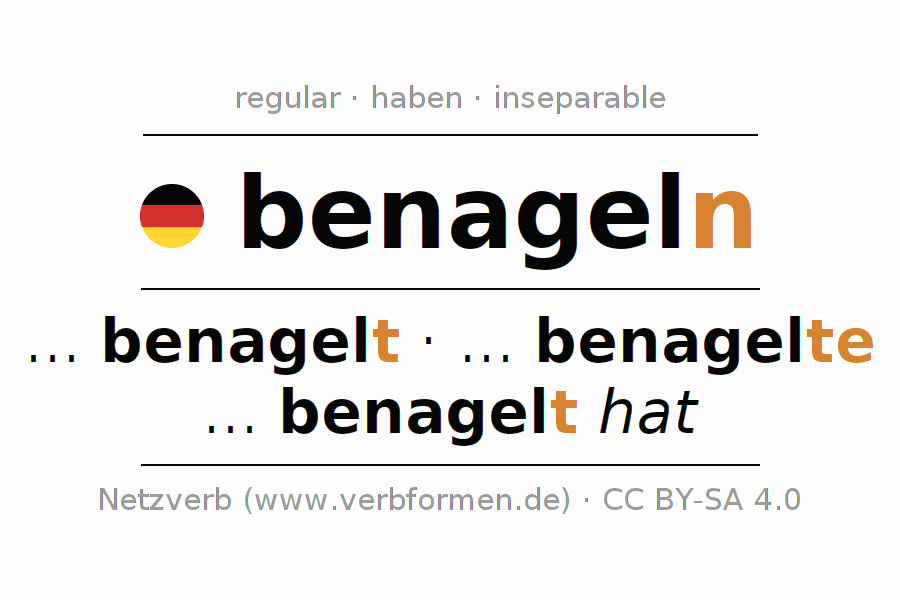 Clear online presentation of the verb 'benageln' including all verb forms. Therfore, the flection of the verb benageln can be useful for homework, tests, exams, German lessons in school, learning German, during studies and adult education. Especially for people learning German it is essential to know the correct flection of a verb (... benagelt - ... benagelte - ... benagelt hat).