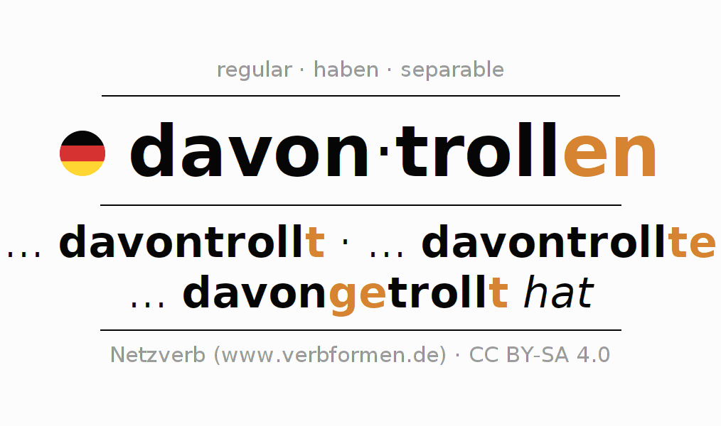 - Present: troll(e) (du) davon, trollen wir davon, trollt (ihr) davon, trollen Sie davon