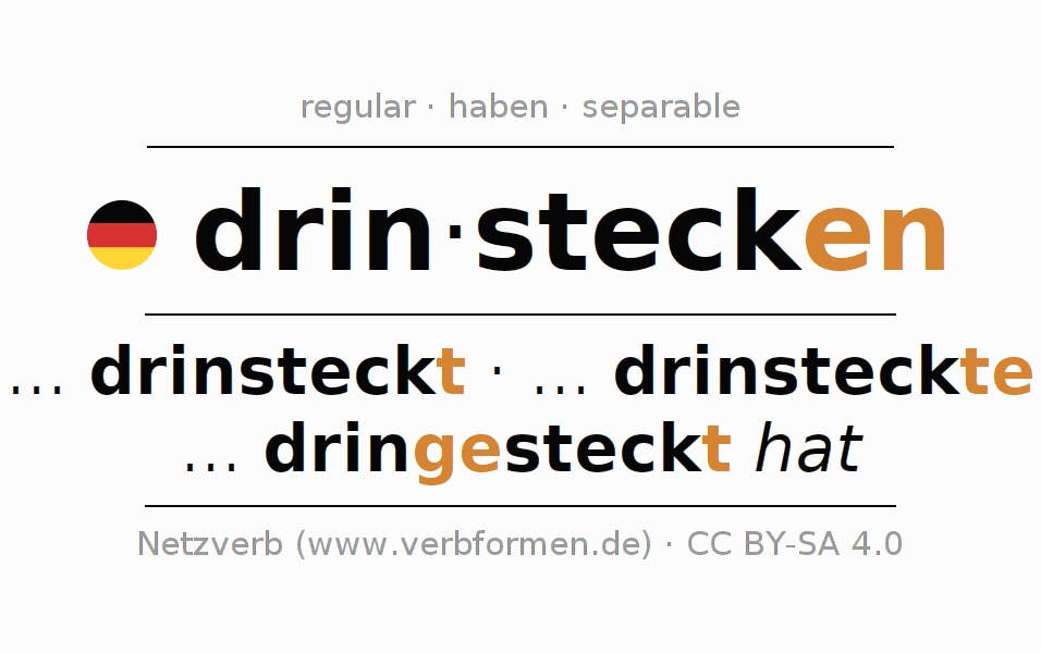 Clear online presentation of the verb 'drin·stecken' including all verb forms. Therfore, the flection of the verb drin·stecken can be useful for homework, tests, exams, German lessons in school, learning German, during studies and adult education. Especially for people learning German it is essential to know the correct flection of a verb (... drinsteckt - ... drinsteckte - ... dringesteckt hat).
