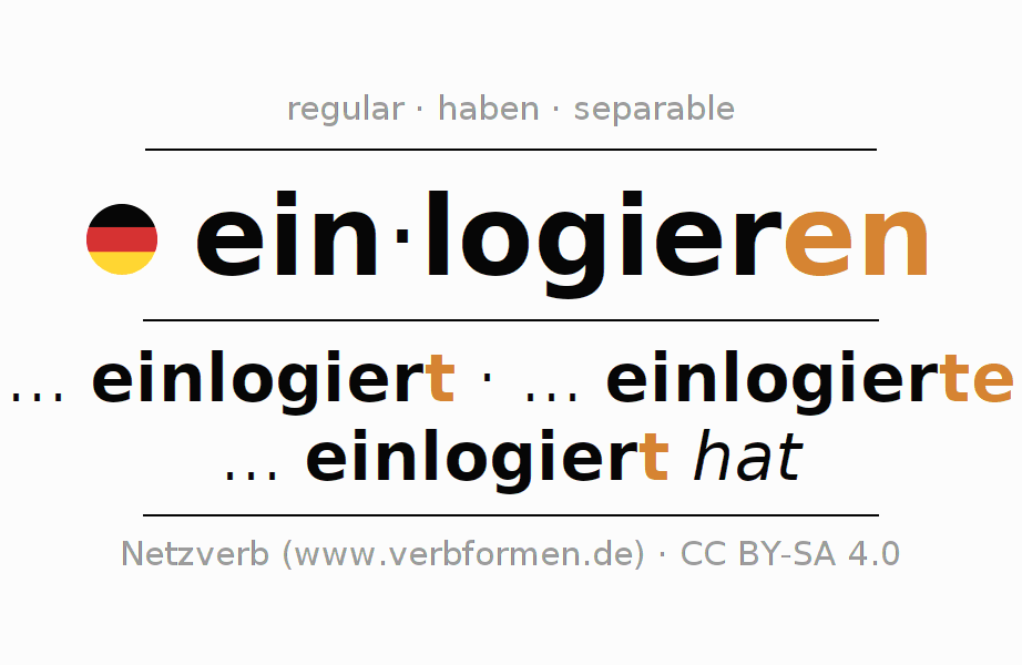 - Future: ... ich einlogieren werde, ... du einlogieren wirst, ... er einlogieren wird, ... wir einlogieren werden, ... ihr einlogieren werdet, ... sie einlogieren werden