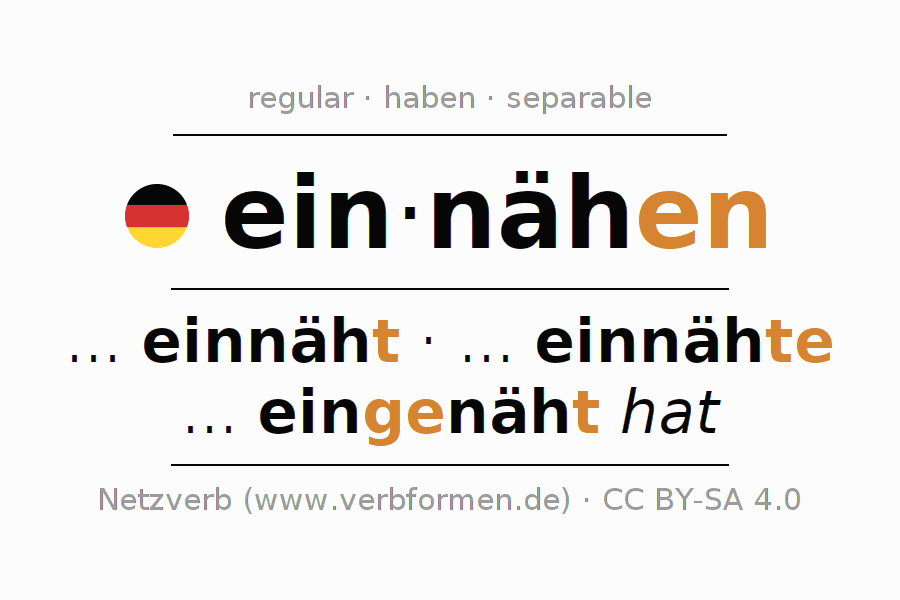 Clear online presentation of the verb 'ein·nähen' including all verb forms. Therfore, the flection of the verb ein·nähen can be useful for homework, tests, exams, German lessons in school, learning German, during studies and adult education. Especially for people learning German it is essential to know the correct flection of a verb (... einnäht - ... einnähte - ... eingenäht hat).