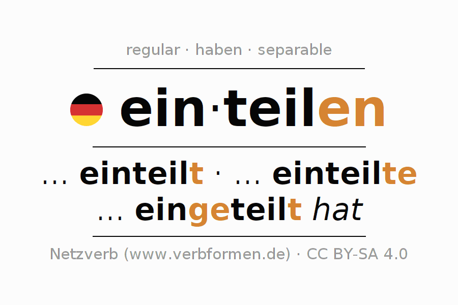 Clear online presentation of the verb 'ein·teilen' including all verb forms. Therfore, the flection of the verb ein·teilen can be useful for homework, tests, exams, German lessons in school, learning German, during studies and adult education. Especially for people learning German it is essential to know the correct flection of a verb (... einteilt - ... einteilte - ... eingeteilt hat).