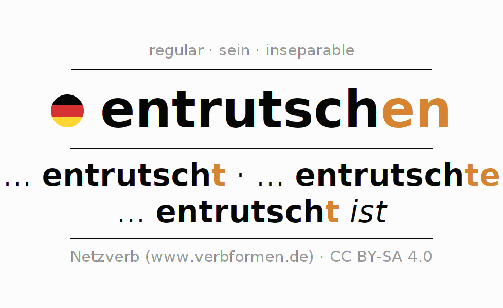 Clear online presentation of the verb 'entrutschen' including all verb forms. Therfore, the flection of the verb entrutschen can be useful for homework, tests, exams, German lessons in school, learning German, during studies and adult education. Especially for people learning German it is essential to know the correct flection of a verb (... entrutscht - ... entrutschte - ... entrutscht ist).