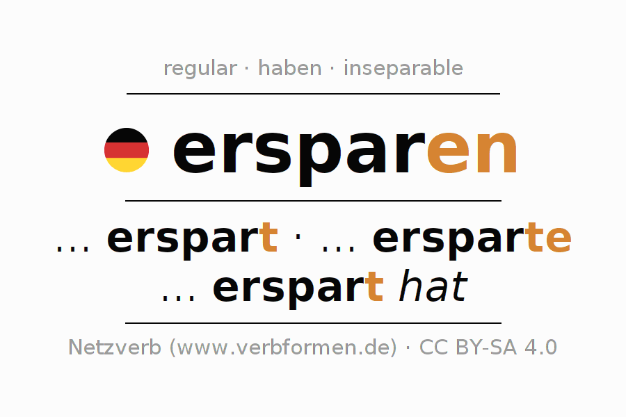 Clear online presentation of the verb 'ersparen' including all verb forms. Therfore, the flection of the verb ersparen can be useful for homework, tests, exams, German lessons in school, learning German, during studies and adult education. Especially for people learning German it is essential to know the correct flection of a verb (... erspart - ... ersparte - ... erspart hat).