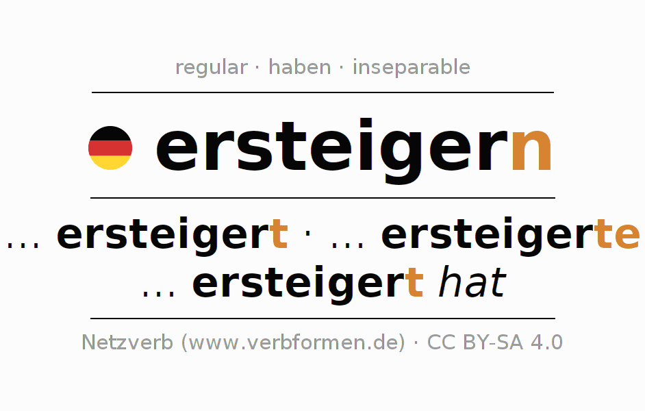 Clear online presentation of the verb 'ersteigern' including all verb forms. Therfore, the flection of the verb ersteigern can be useful for homework, tests, exams, German lessons in school, learning German, during studies and adult education. Especially for people learning German it is essential to know the correct flection of a verb (... ersteigert - ... ersteigerte - ... ersteigert hat).