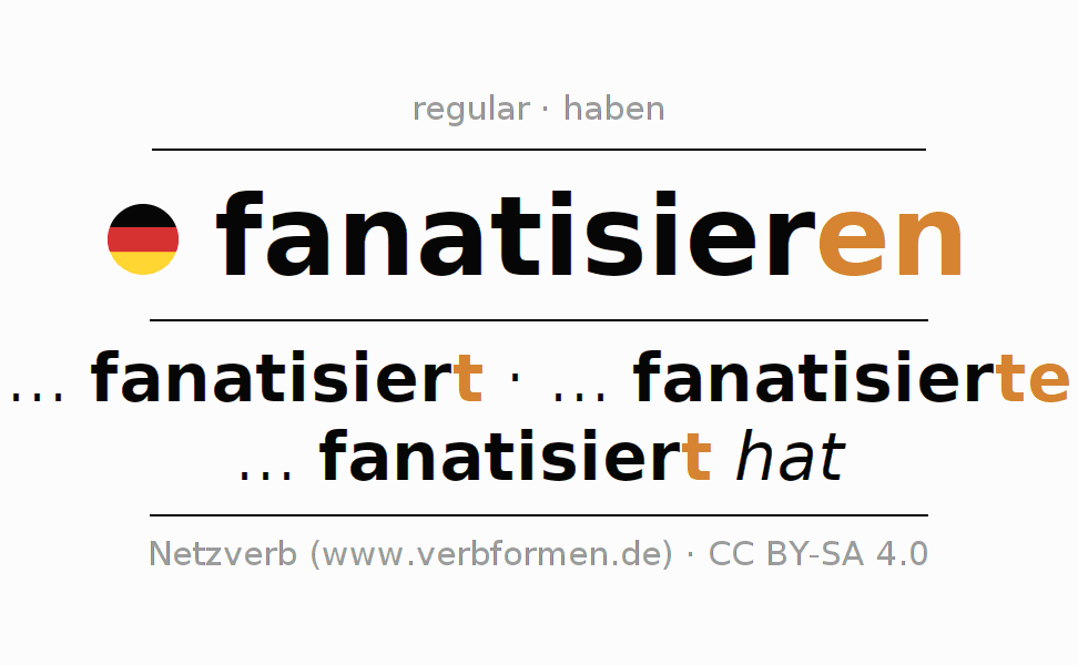 - Future: ... ich fanatisieren werde, ... du fanatisieren wirst, ... er fanatisieren wird, ... wir fanatisieren werden, ... ihr fanatisieren werdet, ... sie fanatisieren werden