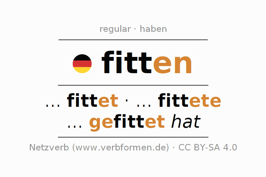 - Present: fitt(e) (du), fitten wir, fittet (ihr), fitten Sie