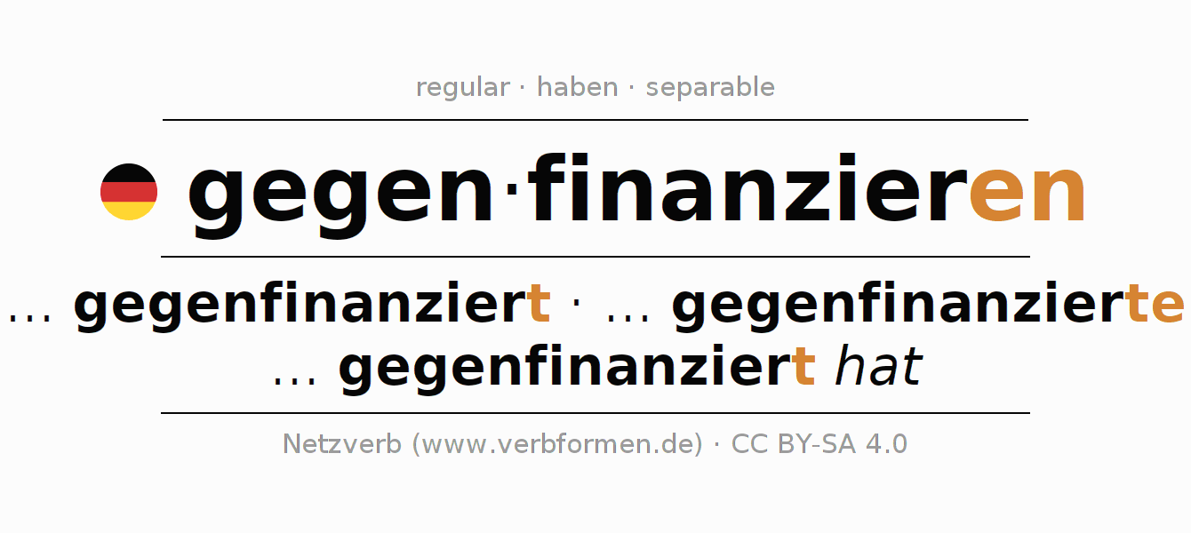 - Perfect: ... ich gegenfinanziert habe, ... du gegenfinanziert hast, ... er gegenfinanziert hat, ... wir gegenfinanziert haben, ... ihr gegenfinanziert habt, ... sie gegenfinanziert haben