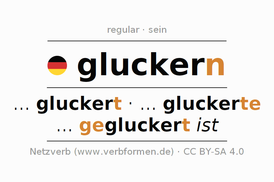 Clear online presentation of the verb 'gluckern' including all verb forms. Therfore, the flection of the verb gluckern can be useful for homework, tests, exams, German lessons in school, learning German, during studies and adult education. Especially for people learning German it is essential to know the correct flection of a verb (... gluckert - ... gluckerte - ... gegluckert ist).