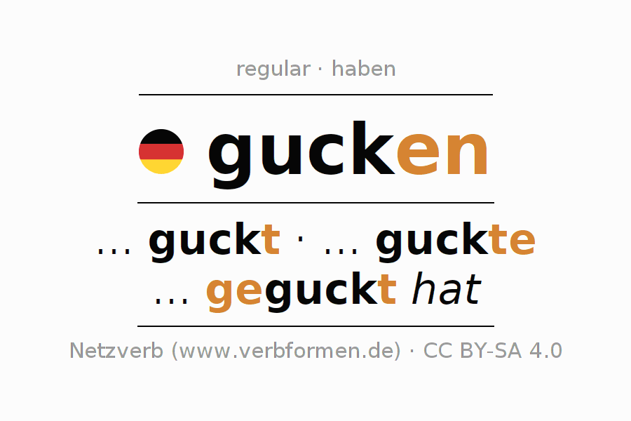 - Present: ... ich guck(e), ... du guckst, ... er guckt, ... wir gucken, ... ihr guckt, ... sie gucken