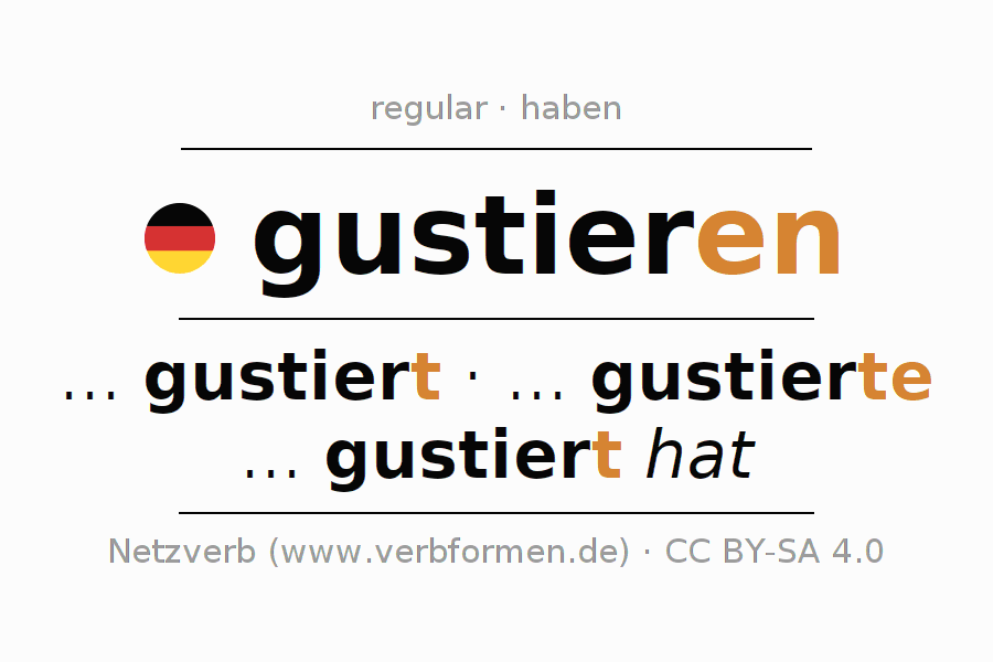 - Perfect: ... ich gustiert habe, ... du gustiert hast, ... er gustiert hat, ... wir gustiert haben, ... ihr gustiert habt, ... sie gustiert haben