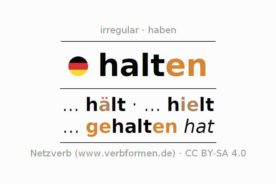 - Present: halt(e) (du), halten wir, haltet (ihr), halten Sie