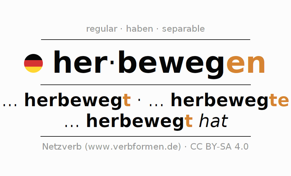 - Present: beweg(e) (du) her, bewegen wir her, bewegt (ihr) her, bewegen Sie her
