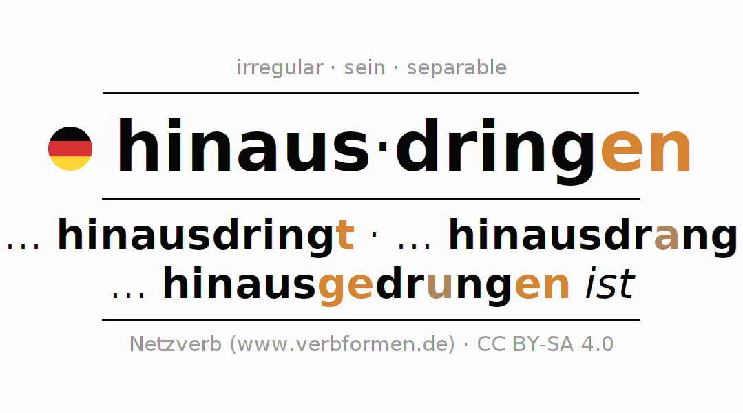 Clear online presentation of the verb 'hinaus·dringen' including all verb forms. Therfore, the flection of the verb hinaus·dringen can be useful for homework, tests, exams, German lessons in school, learning German, during studies and adult education. Especially for people learning German it is essential to know the correct flection of a verb (... hinausdringt - ... hinausdrang - ... hinausgedrungen ist).