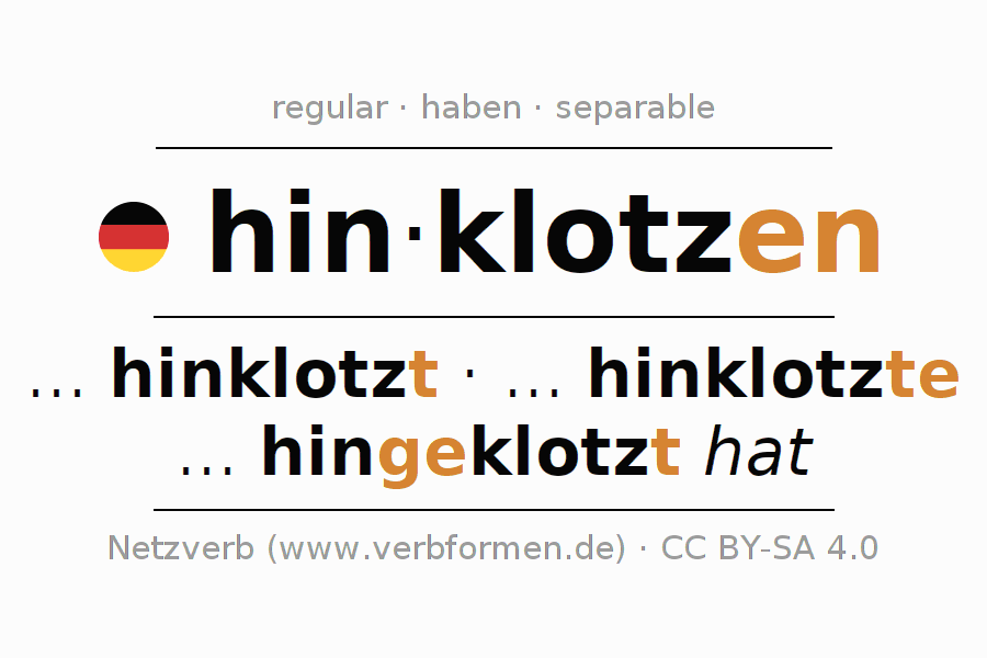 - Perfect: ... ich hingeklotzt habe, ... du hingeklotzt hast, ... er hingeklotzt hat, ... wir hingeklotzt haben, ... ihr hingeklotzt habt, ... sie hingeklotzt haben