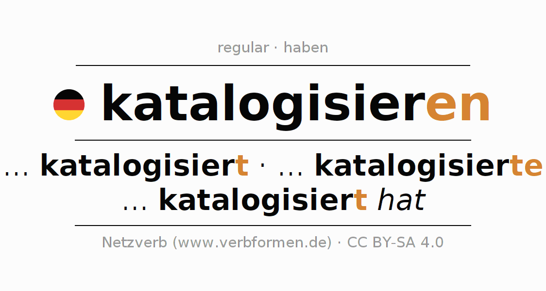 Clear online presentation of the verb 'katalogisieren' including all verb forms. Therfore, the flection of the verb katalogisieren can be useful for homework, tests, exams, German lessons in school, learning German, during studies and adult education. Especially for people learning German it is essential to know the correct flection of a verb (... katalogisiert - ... katalogisierte - ... katalogisiert hat).