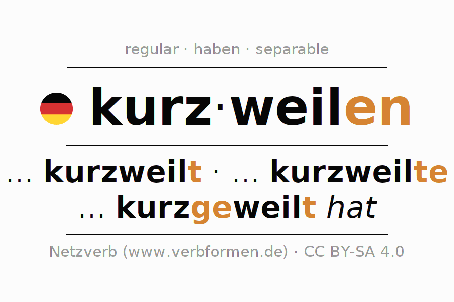 Clear online presentation of the verb 'kurz·weilen' including all verb forms. Therfore, the flection of the verb kurz·weilen can be useful for homework, tests, exams, German lessons in school, learning German, during studies and adult education. Especially for people learning German it is essential to know the correct flection of a verb (... kurzweilt - ... kurzweilte - ... kurzgeweilt hat).