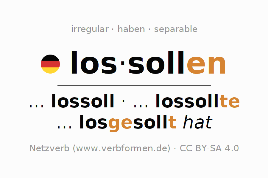 Clear online presentation of the verb 'los·sollen' including all verb forms. Therfore, the flection of the verb los·sollen can be useful for homework, tests, exams, German lessons in school, learning German, during studies and adult education. Especially for people learning German it is essential to know the correct flection of a verb (... lossoll - ... lossollte - ... losgesollt hat).