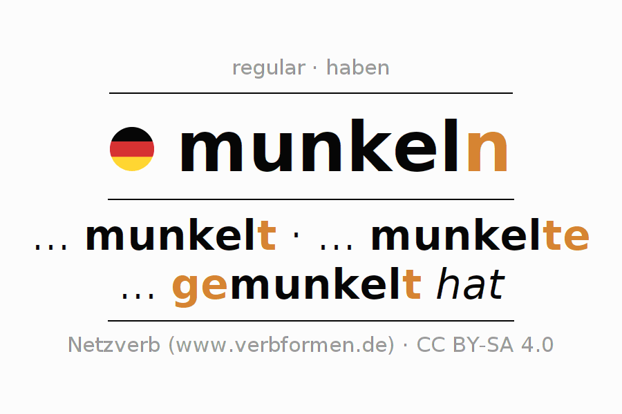Clear online presentation of the verb 'munkeln' including all verb forms. Therfore, the flection of the verb munkeln can be useful for homework, tests, exams, German lessons in school, learning German, during studies and adult education. Especially for people learning German it is essential to know the correct flection of a verb (... munkelt - ... munkelte - ... gemunkelt hat).