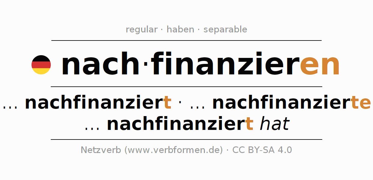 - Perfect: ... ich nachfinanziert habe, ... du nachfinanziert hast, ... er nachfinanziert hat, ... wir nachfinanziert haben, ... ihr nachfinanziert habt, ... sie nachfinanziert haben