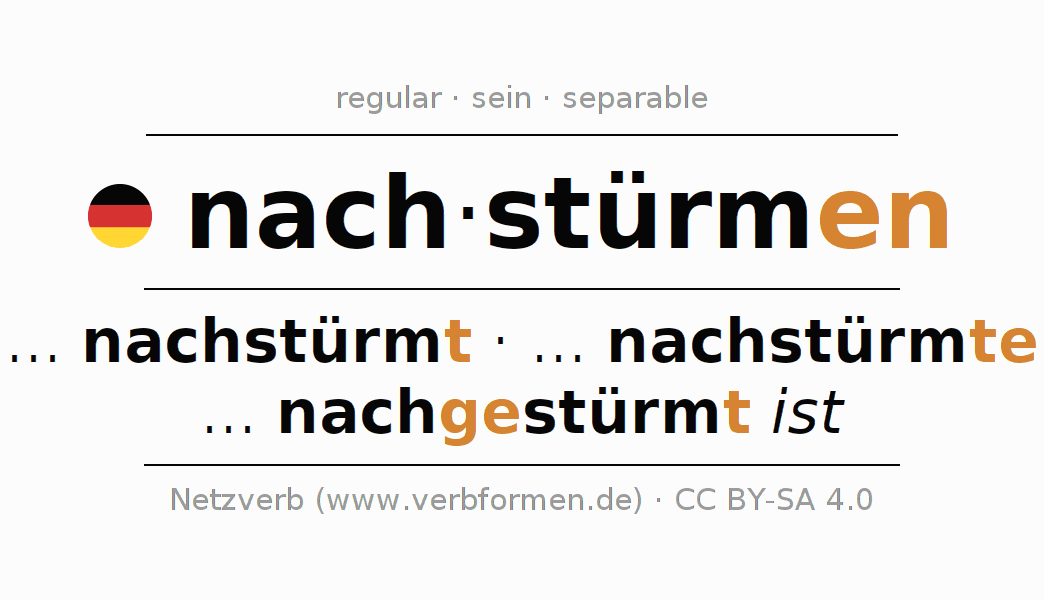 - Present: stürm(e) (du) nach, stürmen wir nach, stürmt (ihr) nach, stürmen Sie nach