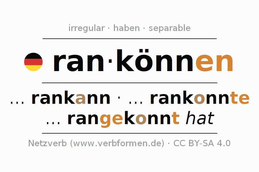 - Future: ... ich rankönnen werde, ... du rankönnen wirst, ... er rankönnen wird, ... wir rankönnen werden, ... ihr rankönnen werdet, ... sie rankönnen werden