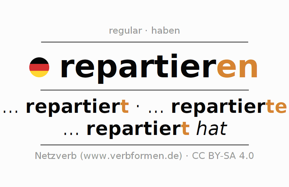 - Present: repartier(e) (du), repartieren wir, repartiert (ihr), repartieren Sie