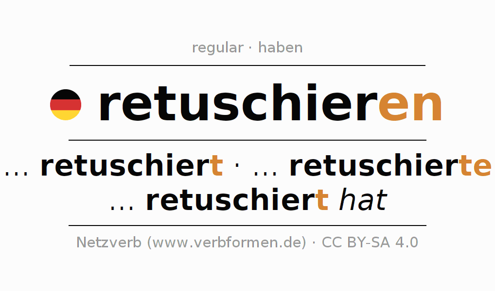 - Present: retuschier(e) (du), retuschieren wir, retuschiert (ihr), retuschieren Sie