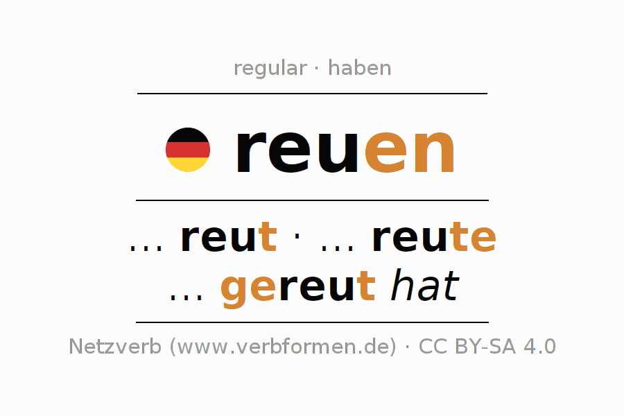 - Present: reu(e) (du), reu(e)n wir, reut (ihr), reu(e)n Sie