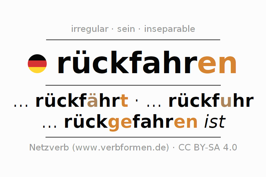 - Future: ... ich rückfahren werde, ... du rückfahren werdest, ... er rückfahren werde, ... wir rückfahren werden, ... ihr rückfahren werdet, ... sie rückfahren werden