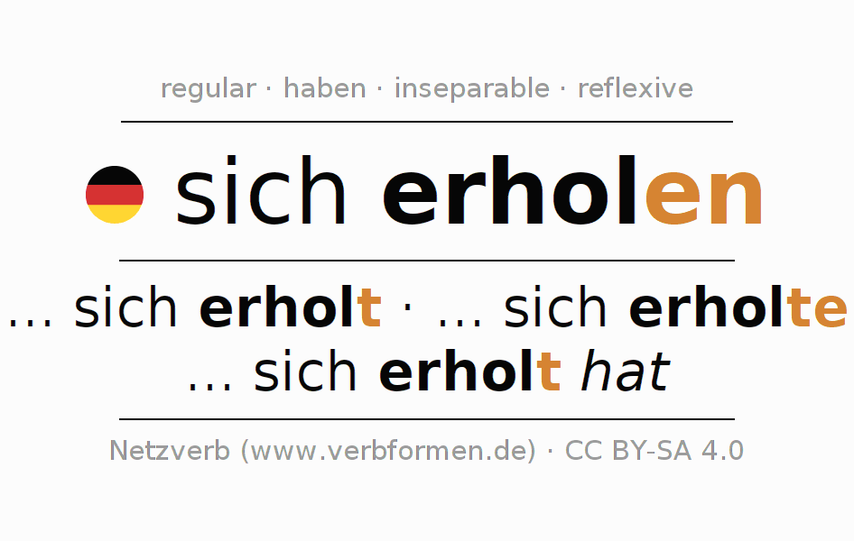 Clear online presentation of the verb 'sich erholen' including all verb forms. Therfore, the flection of the verb sich erholen can be useful for homework, tests, exams, German lessons in school, learning German, during studies and adult education. Especially for people learning German it is essential to know the correct flection of a verb (... sich erholt - ... sich erholte - ... sich erholt hat).