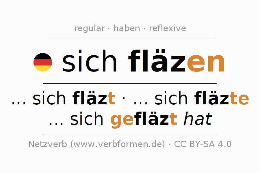 - Future Perfect: ... ich mir/mich gefläzt haben werde, ... du dir/dich gefläzt haben werdest, ... er sich gefläzt haben werde, ... wir uns gefläzt haben werden, ... ihr euch gefläzt haben werdet, ... sie sich gefläzt haben werden