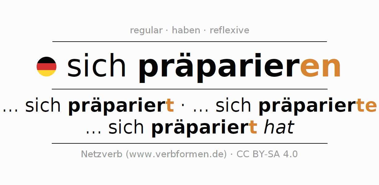 - Present: präparier(e) (du) dir/dich, präparieren wir uns, präpariert (ihr) euch, präparieren Sie sich