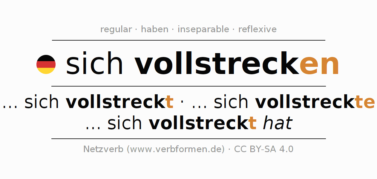 Clear online presentation of the verb 'sich vollstrecken' including all verb forms. Therfore, the flection of the verb sich vollstrecken can be useful for homework, tests, exams, German lessons in school, learning German, during studies and adult education. Especially for people learning German it is essential to know the correct flection of a verb (... sich vollstreckt - ... sich vollstreckte - ... sich vollstreckt hat).