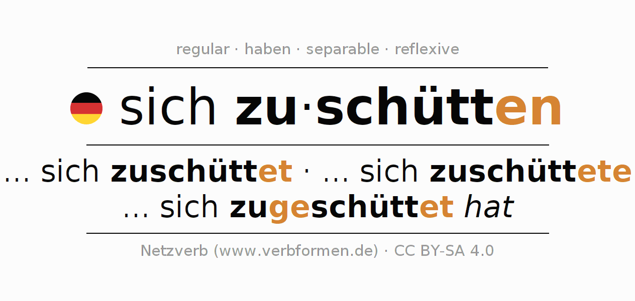 - Future Perfect: ... ich mir/mich zugeschüttet haben werde, ... du dir/dich zugeschüttet haben wirst, ... er sich zugeschüttet haben wird, ... wir uns zugeschüttet haben werden, ... ihr euch zugeschüttet haben werdet, ... sie sich zugeschüttet haben werden