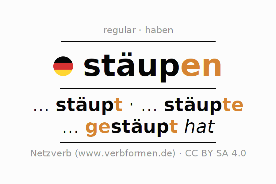 - Future: ... ich stäupen werde, ... du stäupen wirst, ... er stäupen wird, ... wir stäupen werden, ... ihr stäupen werdet, ... sie stäupen werden