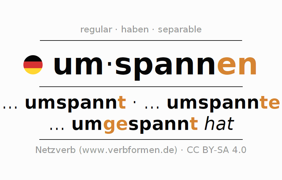 Clear online presentation of the verb 'um·spannen' including all verb forms. Therfore, the flection of the verb um·spannen can be useful for homework, tests, exams, German lessons in school, learning German, during studies and adult education. Especially for people learning German it is essential to know the correct flection of a verb (... umspannt - ... umspannte - ... umgespannt hat).