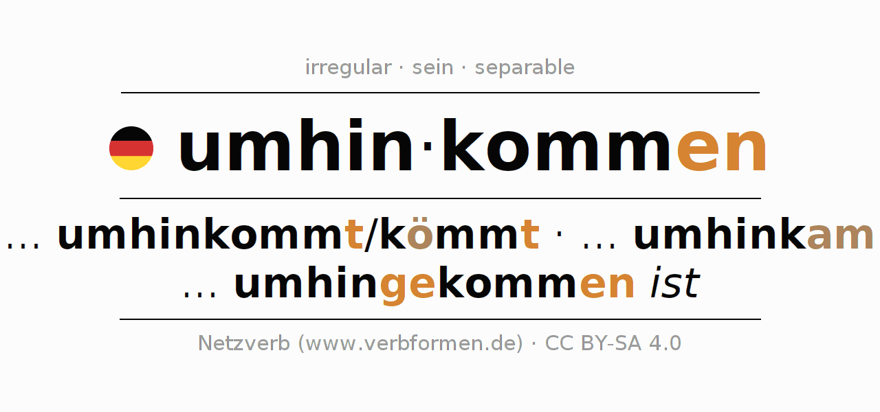 Clear online presentation of the verb 'umhin·kommen' including all verb forms. Therfore, the flection of the verb umhin·kommen can be useful for homework, tests, exams, German lessons in school, learning German, during studies and adult education. Especially for people learning German it is essential to know the correct flection of a verb (... umhinkommt/kömmt - ... umhinkam - ... umhingekommen ist).