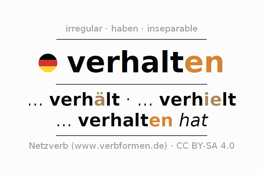 Clear online presentation of the verb 'verhalten' including all verb forms. Therfore, the flection of the verb verhalten can be useful for homework, tests, exams, German lessons in school, learning German, during studies and adult education. Especially for people learning German it is essential to know the correct flection of a verb (... verhält - ... verhielt - ... verhalten hat).