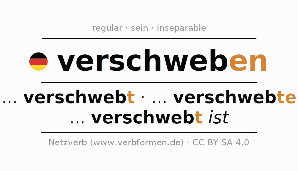 - Present: verschweb(e) (du), verschweben wir, verschwebt (ihr), verschweben Sie