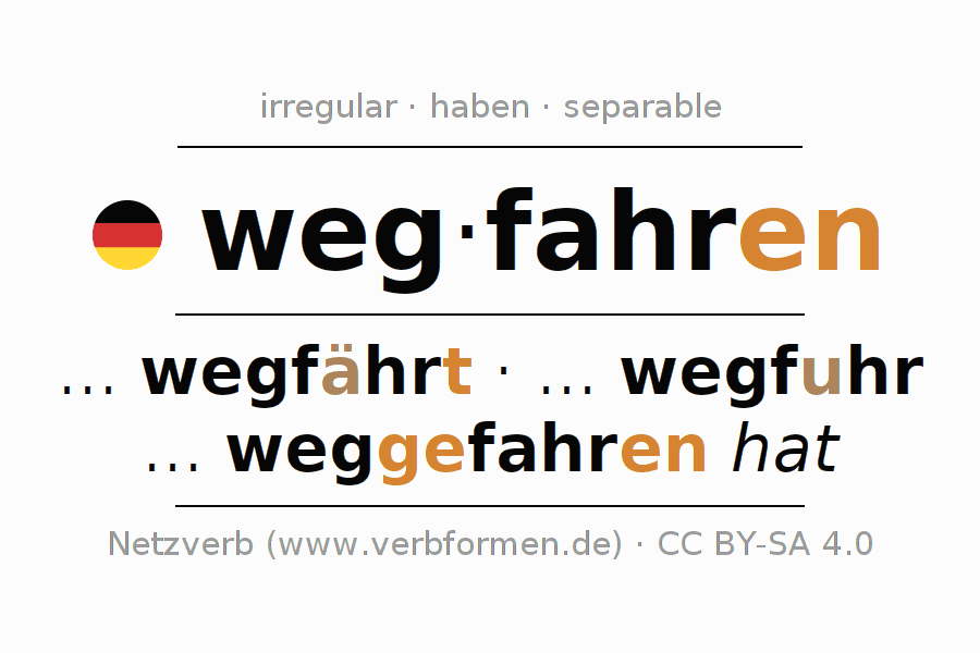 Clear online presentation of the verb 'weg·fahren' including all verb forms. Therfore, the flection of the verb weg·fahren can be useful for homework, tests, exams, German lessons in school, learning German, during studies and adult education. Especially for people learning German it is essential to know the correct flection of a verb (... wegfährt - ... wegfuhr - ... weggefahren hat).