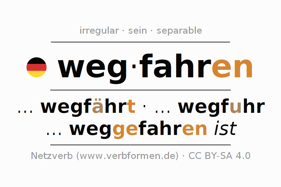 Clear online presentation of the verb 'weg·fahren' including all verb forms. Therfore, the flection of the verb weg·fahren can be useful for homework, tests, exams, German lessons in school, learning German, during studies and adult education. Especially for people learning German it is essential to know the correct flection of a verb (... wegfährt - ... wegfuhr - ... weggefahren ist).