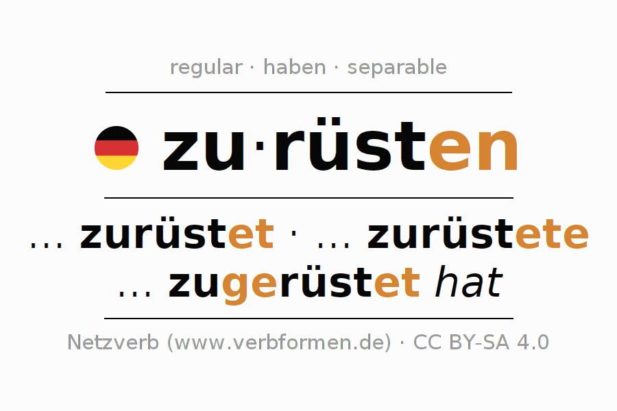 Clear online presentation of the verb 'zu·rüsten' including all verb forms. Therfore, the flection of the verb zu·rüsten can be useful for homework, tests, exams, German lessons in school, learning German, during studies and adult education. Especially for people learning German it is essential to know the correct flection of a verb (... zurüstet - ... zurüstete - ... zugerüstet hat).