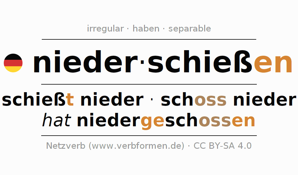 - Present: schieß(e) (du) nieder, schießen wir nieder, schießt (ihr) nieder, schießen Sie nieder