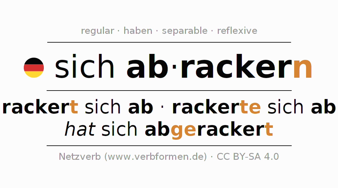 The verb sich abrackern fully conjugated in all persons and numbers in the Participle Present Perfect