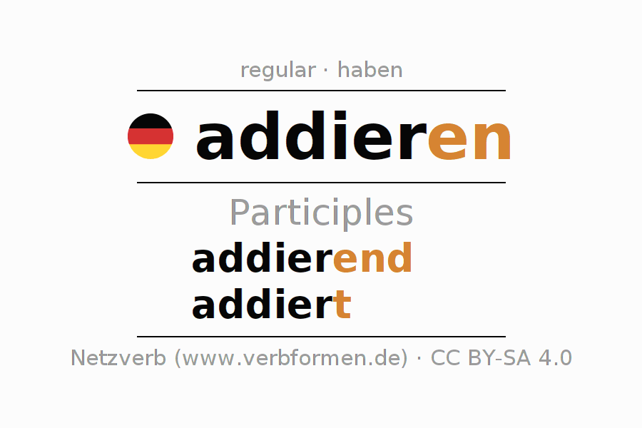 The verb addieren fully conjugated in all persons and numbers in the Participle Present Perfect