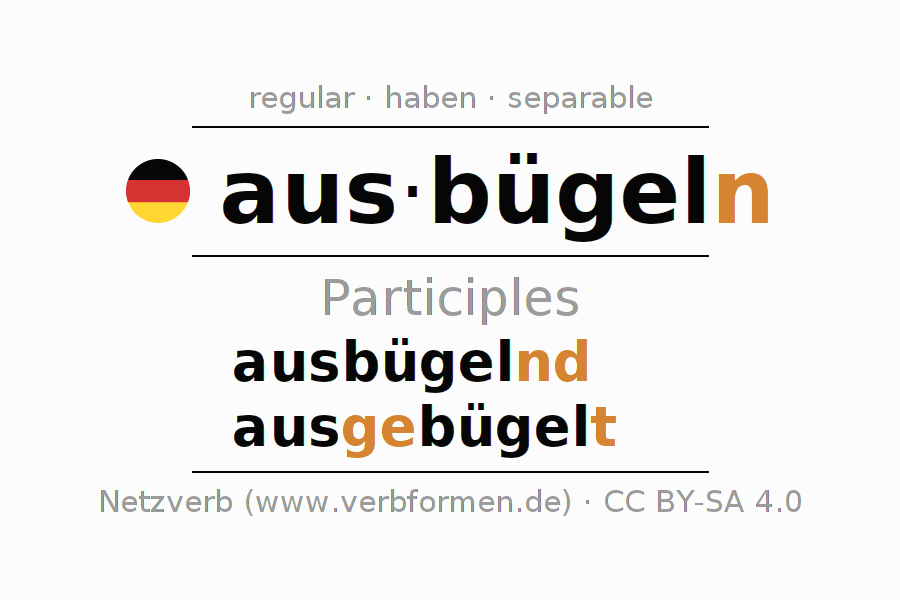 The verb ausbügeln fully conjugated in all persons and numbers in the Participle Present Perfect