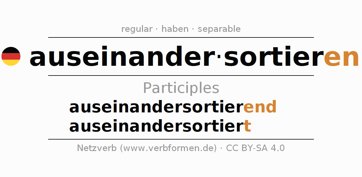 The participles of auseinandersortieren (categorize, sort out) are: auseinandersortierend, auseinandersortiert.